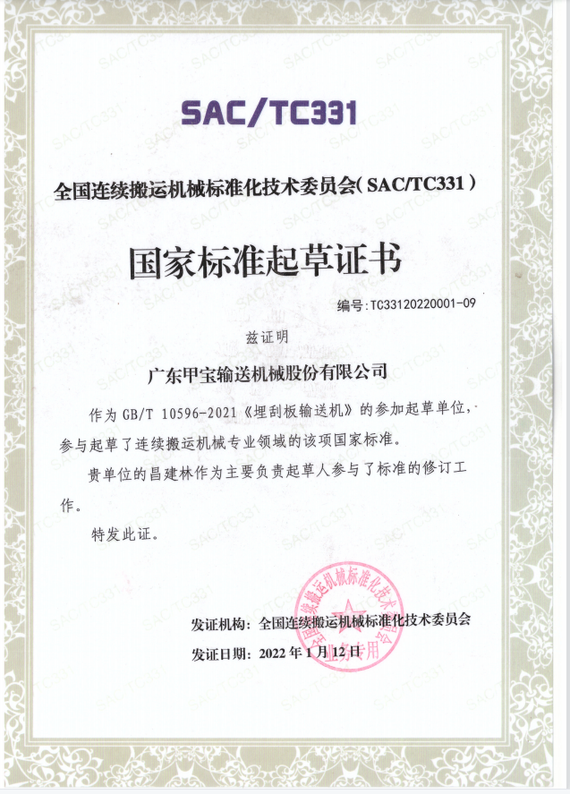 发布日期 : 2022-01-20 14:14:04 近日,国家质量监督检验检疫总局、国家标准化管理委员会批准发布了GB/T10596-2021《埋刮板输送机》国家标准,广东乐思体育额股份有限公司作为此标准的起草单位,积极参与了标准的起草工作。鉴于其为连续搬运机械标准化工作做出的突出贡献,全国连续搬运机械标准化技术委员会对其进行了嘉奖表彰。